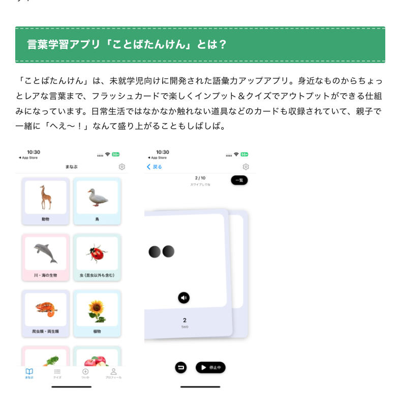 みんなで楽しみながら学ぼう! 未就学児・小学生向けの日本語語彙学習アプリ フラッシュカードと音声で 楽しく言葉を身につけられます